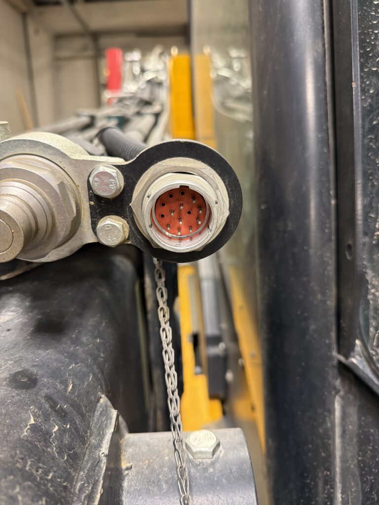 When identifying what electrical connector you will need for your new multi-function attachment, you first need to locate it on your machine. The electrical connector is a round port, around 1/2″ in diameter that usually has a metal cap with chain right next to your auxiliary hydraulic couplers. If you do not see this on your machine, or are confident you do not have an electrical connector, refer to the section below titled ‘What If My Machine Has No Electrical Connection?’