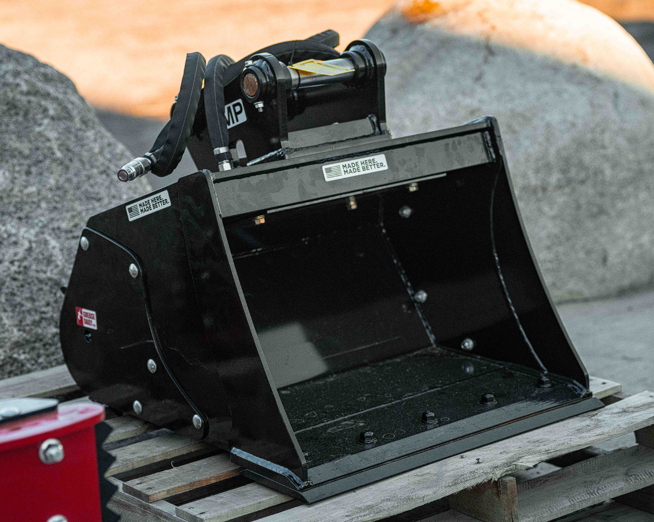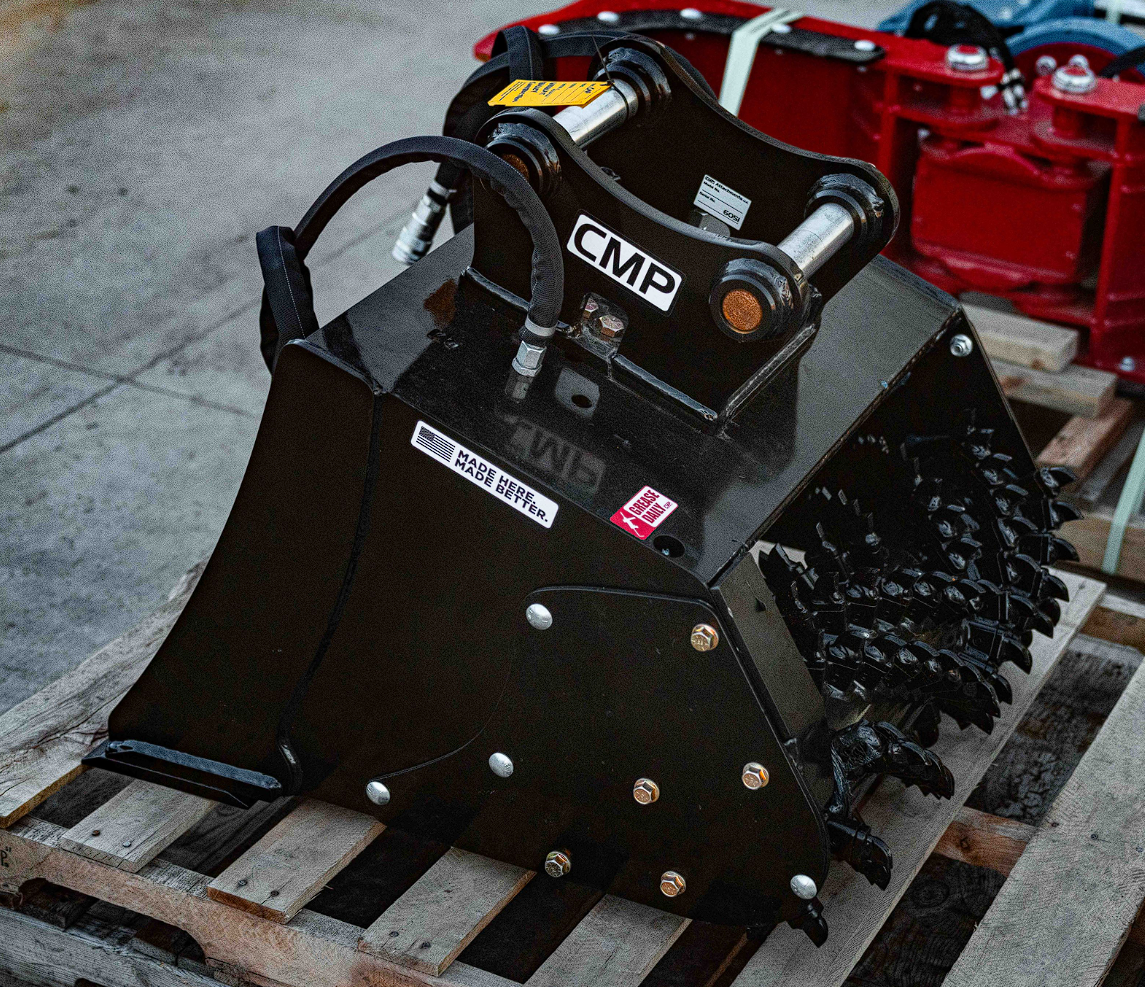 The CMP Excavator Hydra Milling Bucket transforms your excavator into a powerful soil conditioner, grinder, and milling attachment. Featuring a direct drive bi-directional drum, it delivers fast, precise material removal and conditioning. Use it for grinding limestone, trenching, winter digging, or soil prep with ease. The carbide mining teeth come standard, with optional replaceable shark teeth for heavy-duty work. Its densely spaced cutting pattern ensures smooth, even performance at up to a 3" cut depth, while AR steel construction and a tough black powder coat provide long-lasting durability. Perfect for operators seeking maximum efficiency, versatility, and precision in one rugged attachment.