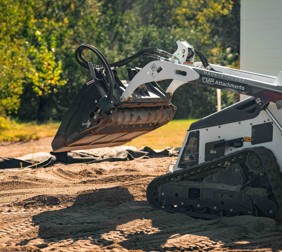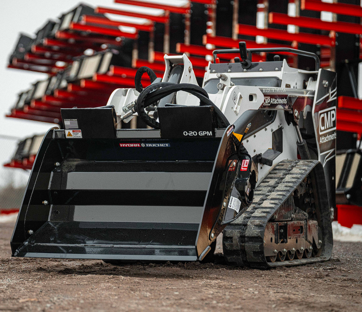 The CMP Mini Skid Steer Hydra Bucket combines a heavy-duty bucket with a built-in hydraulic grinder. Its carbide-toothed drum pulverizes material on contact, powered by a high torque motor and sealed bearings. No high-flow required, just efficient, versatile performance in one rugged attachment.