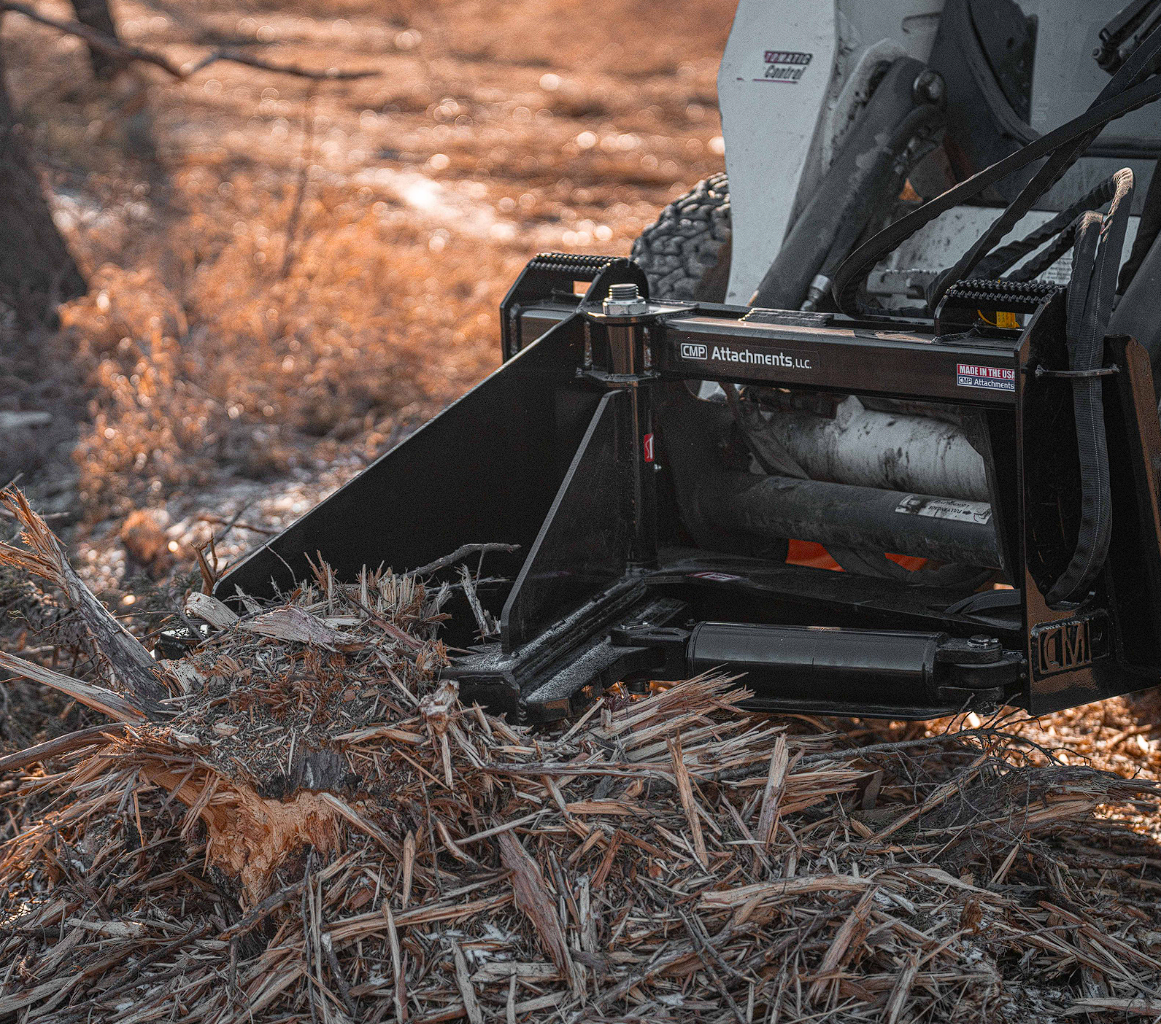The CMP Skid Steer Hydraulic Tree Puller makes uprooting small trees, removing posts, and clearing brush effortless. Designed for forestry, farm, and fencing applications, its oversized 3" cylinder delivers unmatched clamping force for even the toughest roots. AR400 serrated jaws, reinforced hinges, and gusseted tines provide long-lasting durability and performance. Zero-gap closure ensures thin brush and roots are gripped without slippage. Built to last with a black powder coat finish, this heavy-duty attachment features 23" of usable jaw length and stands up to years of rugged use on your skid steer.