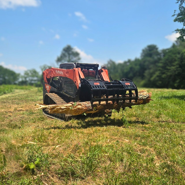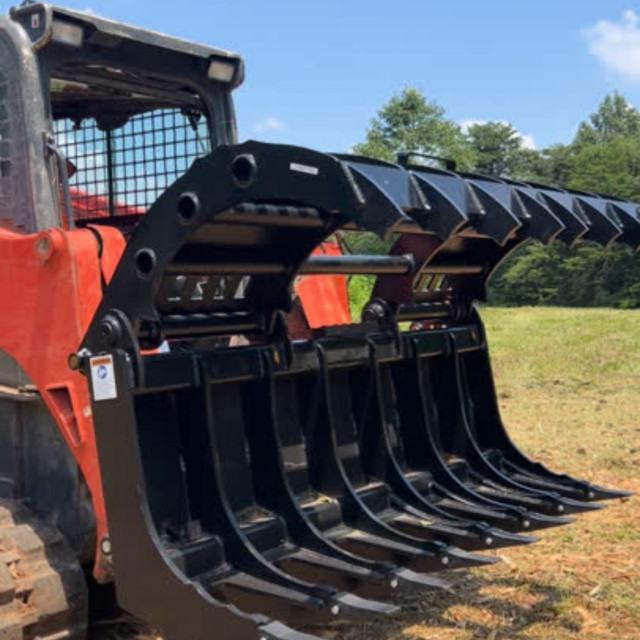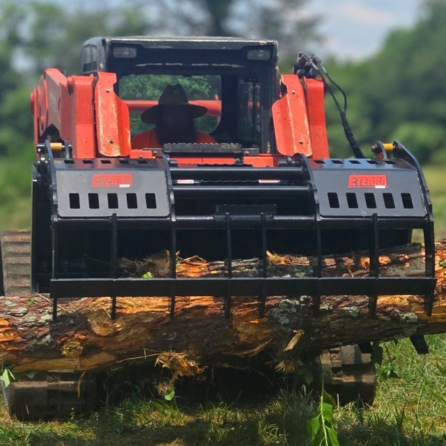 The Eterra Surge Grapple Rake is a heavy-duty land-clearing attachment built from 3/4" steel and reinforced with a 4" square-tube frame. Dual hydraulic cylinders deliver up to 4,000 PSI of clamping force, while a 43" jaw opening makes handling debris easy. Ideal for 80+ HP skid steers.