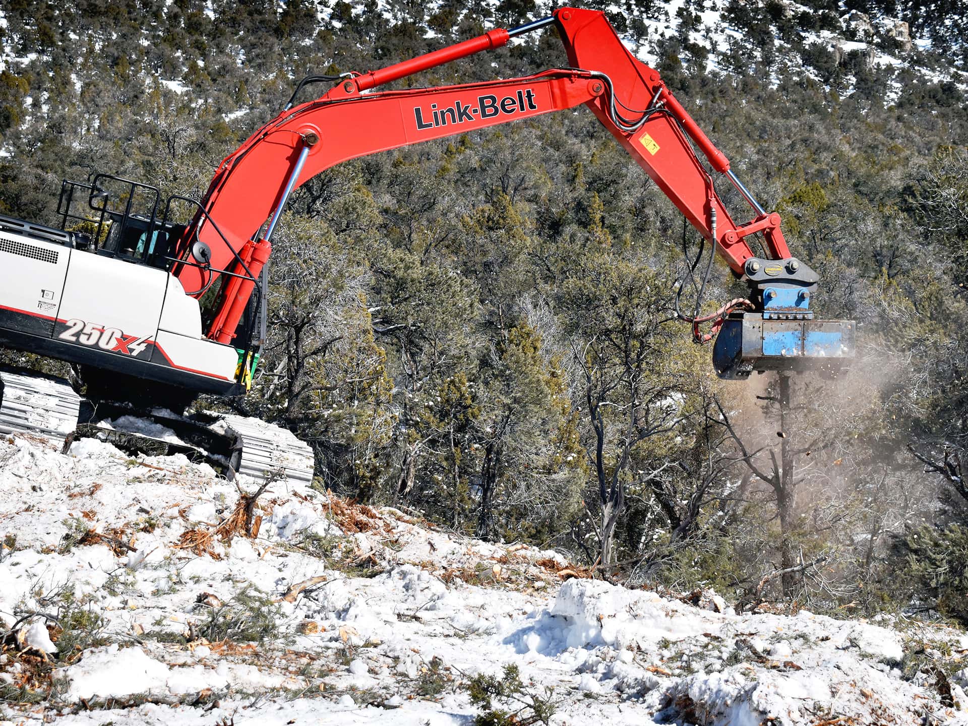 Available in 36”, 48”, 60” inch cutting widths, the HDM’s upsized quad and double-carbide tooling options, bent axis piston 80cc or 107cc motor options, and 20” inch drum diameter offers undeniably consistent, fast and heavy-duty mulching action. Reinforced and replaceable wear shoes, and the extra robust boxed-in construction, heavily utilizing 100,000 PSI steel, means you can mulch each tree straight to the ground as fast as the job requires, and better process the mulch on the ground to as fine as the job requires. The easy-to-remove panels to thoughtful service areas means faster maintenance and maximum up time. Some notable application types for this attachment are forest/range conservation, right-of-way maintenance, and industrial site preparation/maintenance.