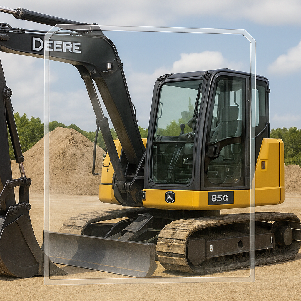 Enhance operator safety and comfort with the John Deere 85D & 85G Polycarbonate Excavator Door, designed to withstand the toughest job site conditions. Made from impact-resistant polycarbonate, this OEM replacement door is 260 times stronger than standard glass while being half the weight, providing unmatched durability and protection from flying debris, rocks, and branches. Designed for seamless installation, this 1/2" thick polycarbonate windshield fits directly into the existing frame using factory mounting holes and seals—no extra hardware required. The Supercoat™ technology on both sides enhances abrasion resistance, ensuring long-lasting clarity, reduced glare, and protection against scratches. Beyond protection, this replacement door also reduces noise, improves insulation, and enhances light transmittance, keeping your cab cooler in summer and warmer in winter for increased efficiency and operator comfort. Ideal for brush clearing, mulching, and mowing operations, the Shields CAT Polycarbonate Door is a must-have upgrade for operators seeking superior durability, visibility, and efficiency. This is the upper window for John Deere 85D & 85G.
