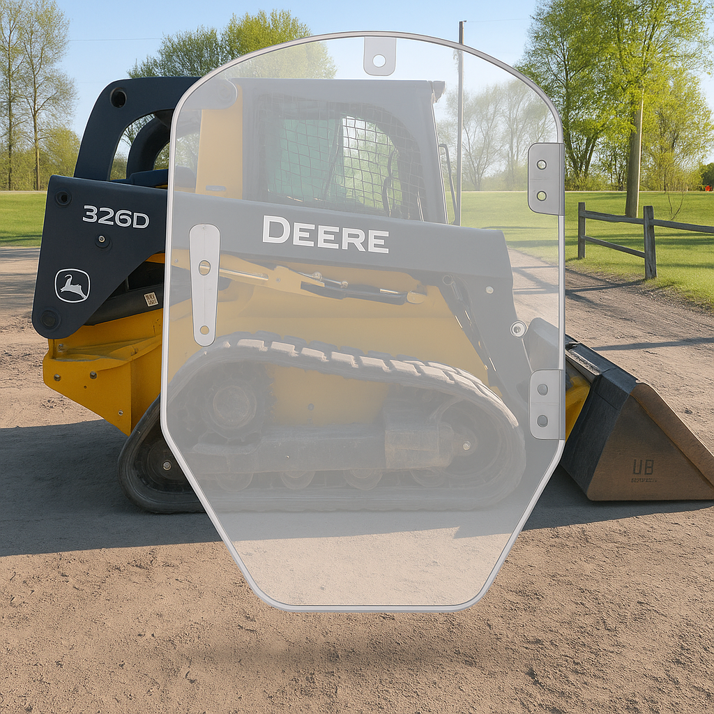 Enhance operator safety and comfort with the Shields John Deere D Series Polycarbonate Replacement Door, designed to withstand the toughest job site conditions. Made from impact-resistant polycarbonate, this OEM replacement door is 260 times stronger than standard glass while being half the weight, providing unmatched durability and protection from flying debris, rocks, and branches. Designed for seamless installation, this 1/2" thick polycarbonate windshield fits directly into the existing frame using factory mounting holes and seals—no extra hardware required. The Supercoat™ technology on both sides enhances abrasion resistance, ensuring long-lasting clarity, reduced glare, and protection against scratches. Beyond protection, this replacement door also reduces noise, improves insulation, and enhances light transmittance, keeping your cab cooler in summer and warmer in winter for increased efficiency and operator comfort. This replacement door fits John Deere D Series Models: 318, 319, 320, 323, 326, 328, 329, 332, and 333.