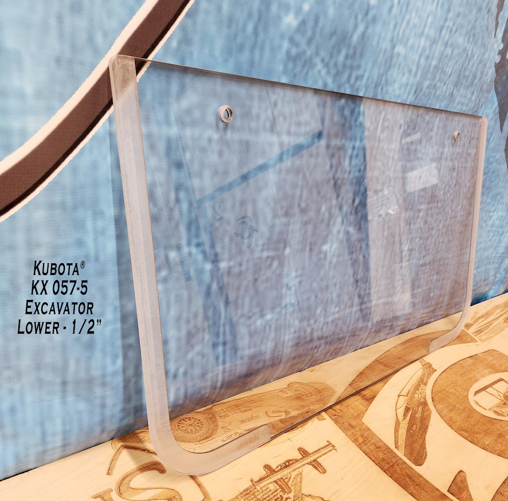 The Kubota Polycarbonate Replacement Door offers 260x the strength of glass at half the weight, providing superior protection against flying debris, rocks, and branches. This 1/2" thick, impact-resistant door seamlessly replaces OEM glass using factory mounting holes and seals—no extra hardware needed. It also reduces noise, improves insulation, and enhances light transmittance for a more comfortable cab environment. Ideal for brush clearing, mulching, and mowing, this upgrade ensures maximum durability, visibility, and efficiency in tough job site conditions. This is the lower window for Kubota KX 057-5, Kubota U48-5, and Kubota U55-5.