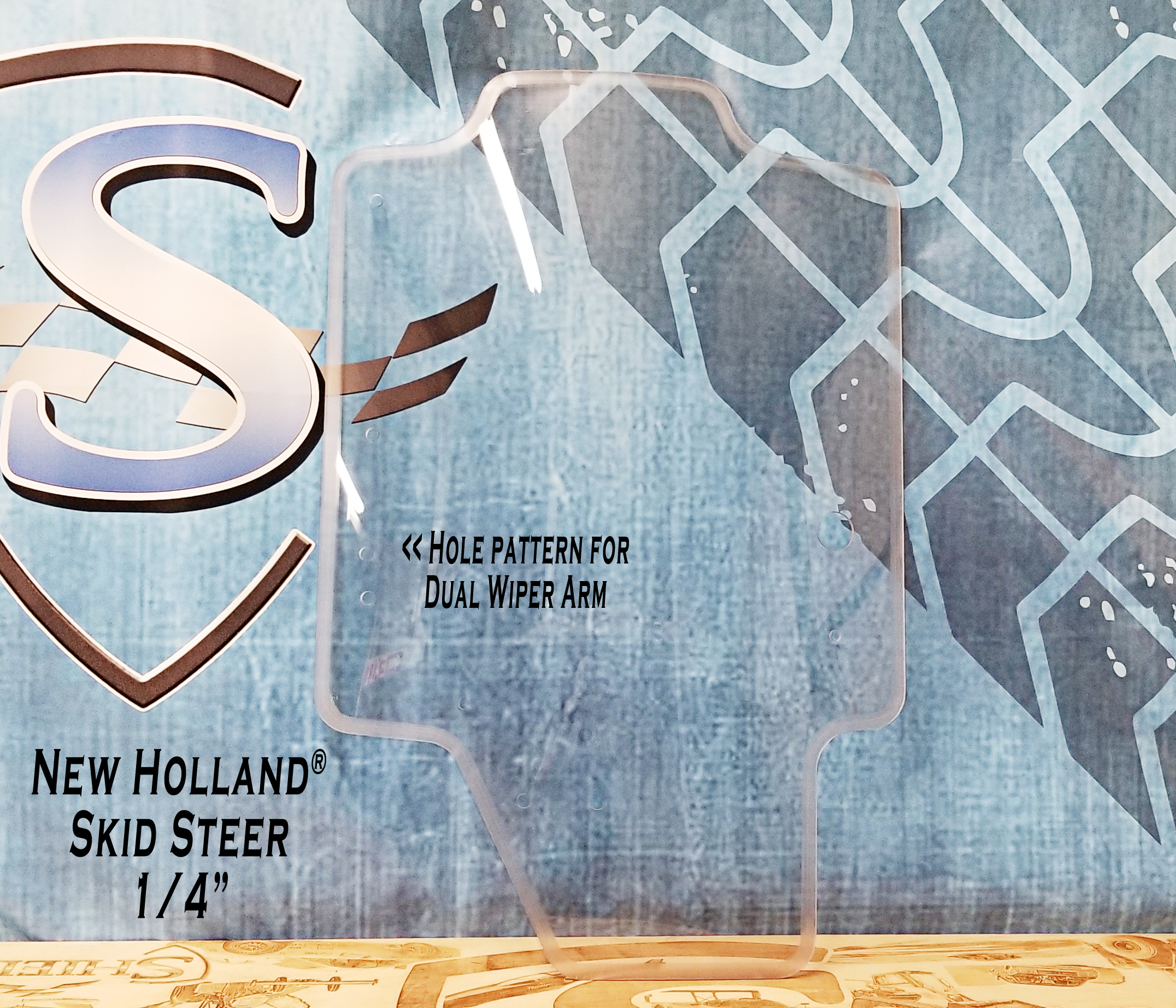 Enhance operator safety and comfort with the Shields New Holland L & C Series Polycarbonate Replacement Door, designed to withstand the toughest job site conditions. Made from impact-resistant polycarbonate, this OEM replacement door is 260 times stronger than standard glass while being half the weight, providing unmatched durability and protection from flying debris, rocks, and branches. Designed for seamless installation, this 1/2" thick polycarbonate windshield fits directly into the existing frame using factory mounting holes and seals—no extra hardware required. The Supercoat™ technology on both sides enhances abrasion resistance, ensuring long-lasting clarity, reduced glare, and protection against scratches. Beyond protection, this replacement door also reduces noise, improves insulation, and enhances light transmittance, keeping your cab cooler in summer and warmer in winter for increased efficiency and operator comfort. This fits New Holland L & C Series machines, with dual arm attachment. Please reach out to our sales team if you're not sure if your machine has single or dual arms.