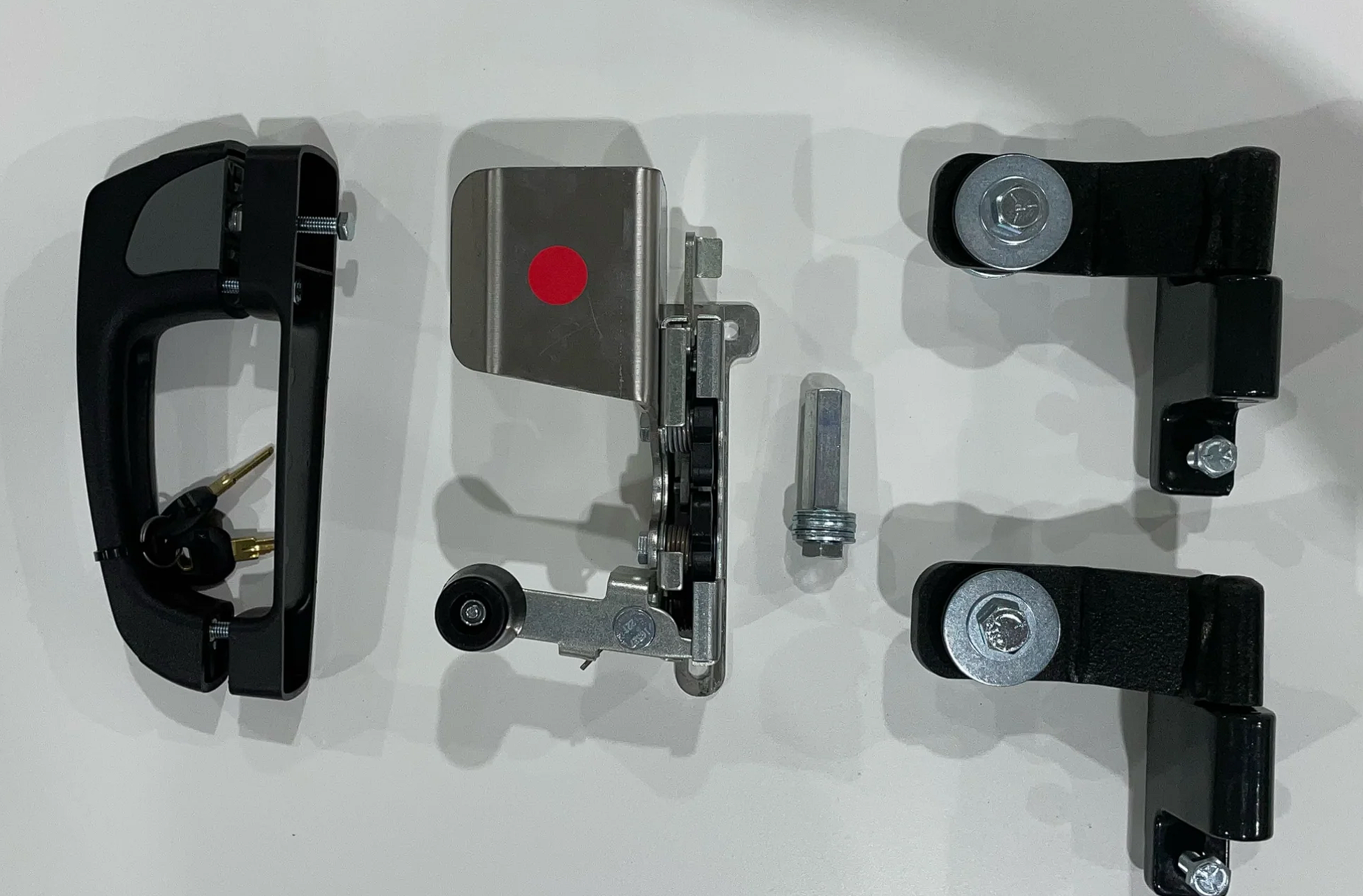 - Complete retrofit kit with no drilling required. Includes: Handle, Locking Latch/Keys, Hinges, Weather Seal Gasket, & All Nuts, Bolts, and Washers.