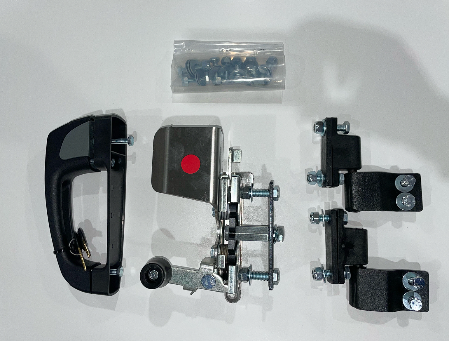 - Complete retrofit kit with no drilling required. Includes: Handle, Locking Latch/Keys, Hinges, Weather Seal Gasket, & All Nuts, Bolts, and Washers.